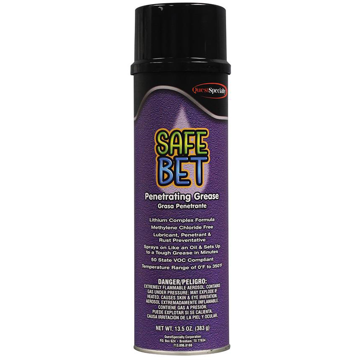 SAFE BET is a multi-purpose lubricant, penetrant and rust preventative that changes from a fluid to become a tough, protective grease in minutes. Ideal for hard to reach areas on all door hardware and operator drive mechanisms. Once grease has set up it will outlast any regular oil or silicone. It is VOC compliant in all 50 states. For use on machinery, conveyors, chains, cables, gears, winches, tools, rollers, springs, hinges, operators and rollers. Areas of use include farms, oil rigs and refineries, bottling plants, dairies, paper mills, cotton gins, air conditioning, industrial plants, textile plants, lumber mills, cement plants and automotive/motorcycle/marine repair. Lithium complex formula. Methylene chloride-free formula. Lubricant, penetrant & rust preventative. Sprays on like an oil & sets up to a tough grease in minutes. 50 state VOC compliant. Temperature range 0°F to 350°F. Available in 12 - 20 oz cans/case, 13.5 oz net weight.